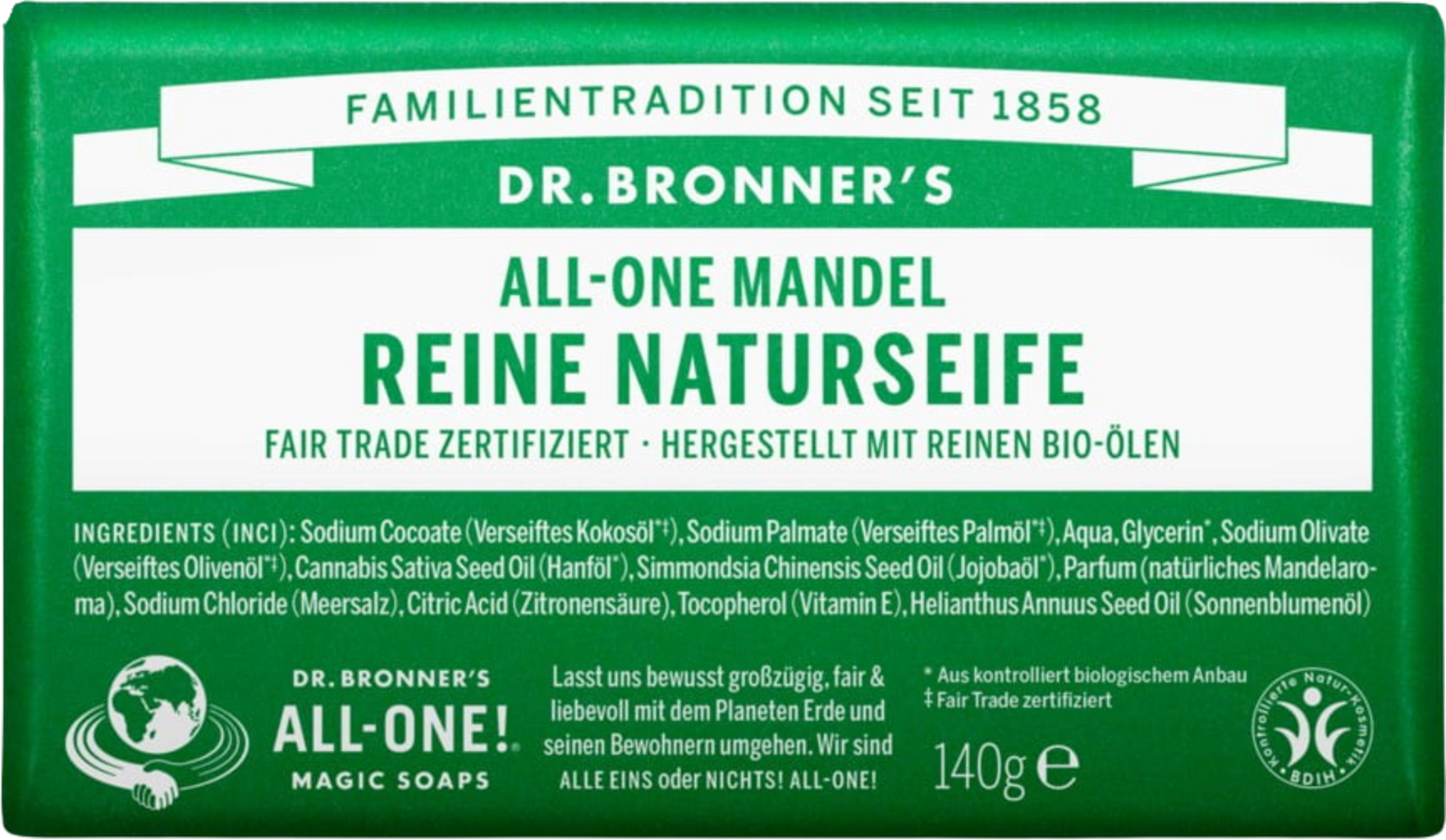 Dr. Bronner's Bar Soap Mandel, Dr. Bronner's BIO/FAIRTRADE/VEGAN (140 g)