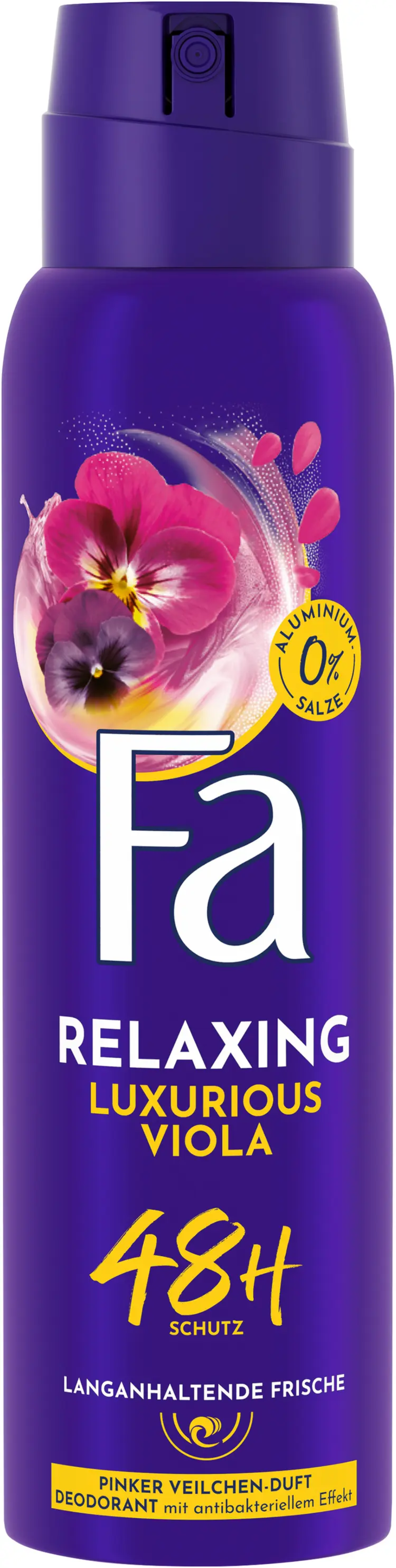 Der Fa Luxurious Moments Deospray verzaubert deinen Tag mit seinem angenehm-blumigen Duft nach pinker Viola. Der starke 48 Stunden Schutz verhindert unangenehmen Geruch, ohne dabei Flecken zu hinterlassen. Zusätzlich ist die Formel frei von Aluminiumsalzen, hautfreundlich und vegan.