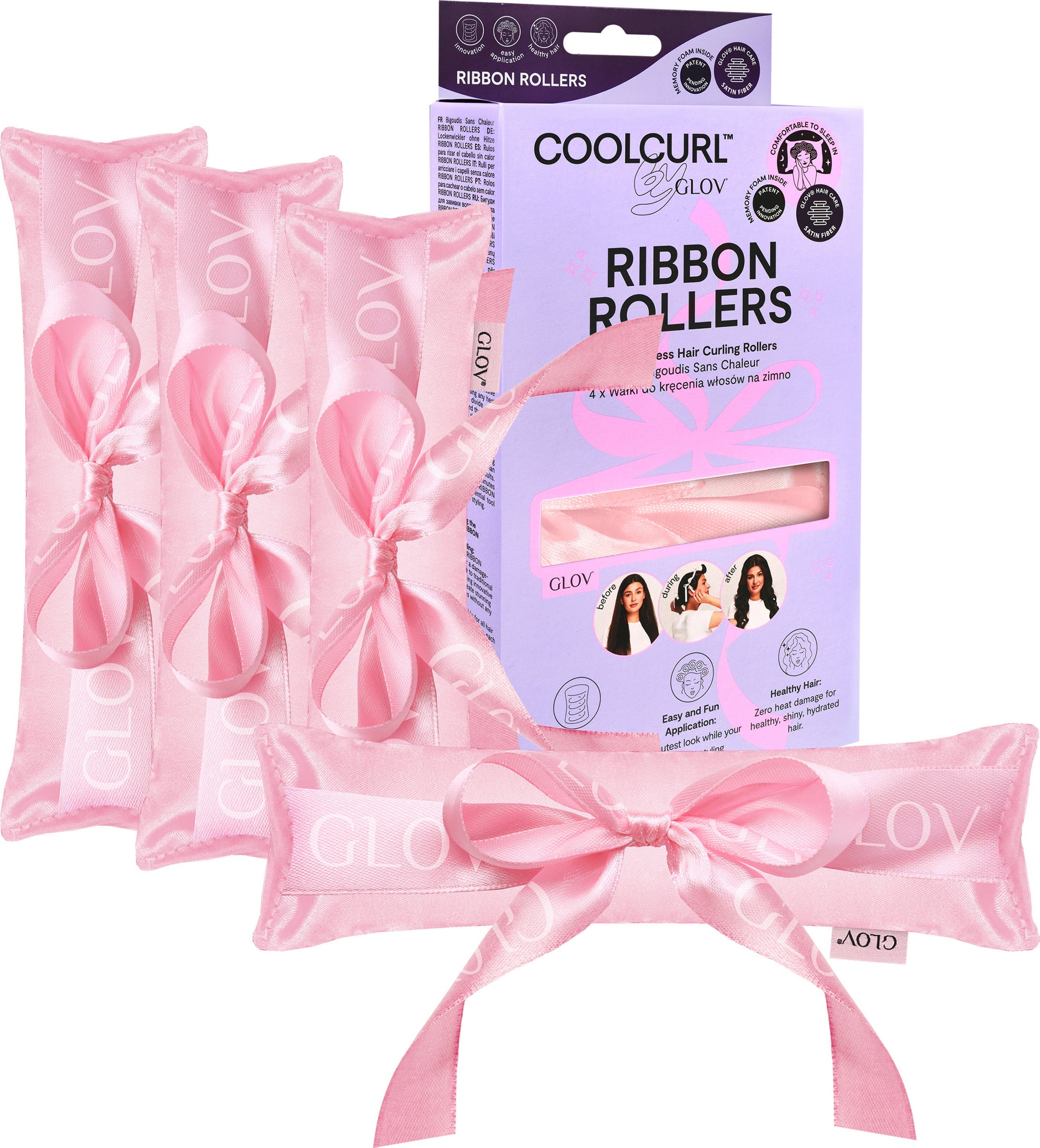 Mit den COOLCURL™ Ribbon Rollers kannst du ohne großen Aufwand oder Hitze traumhafte Locken und Wellen zaubern. Sier bestehen aus luxuriösem Satin und Memory-Foam und zwei hübschen Schleifen. Die innovativen Lockenwickler sind leicht sowie platzsparend, deshalb passen sie auch in jedes Gepäck. Sie sind auch für längeres oder dichtes Haar geeignet, allerdings wird es empfohlen, für sehr dichtes oder sehr langes Haar zwei Sets zu verwenden.