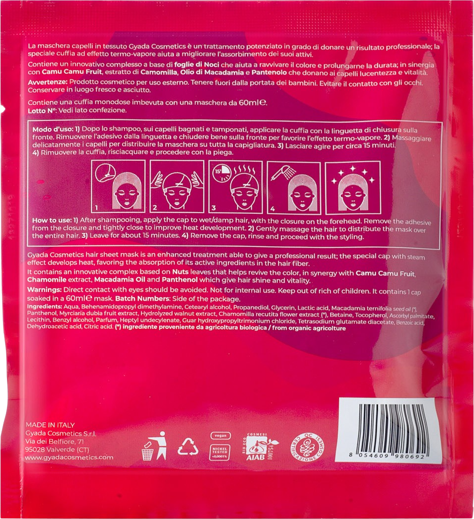 Der innovative Wirkstoffkomplex dieser Farbschutz-Maske kann durch den Wärme-Effekt der Haube optimal von der Haarfaser aufgenommen werden. Die Formulierung auf Basis von Walnussblättern, hilft die Farbe zu beleben und ihre Haltbarkeit zu verlängern. In Synergie mit Camu-Camu, Kamillen-Extrakt, Macadamia-Öl und Panthenol verleiht die Maske dem Haar Glanz und Vitalität.