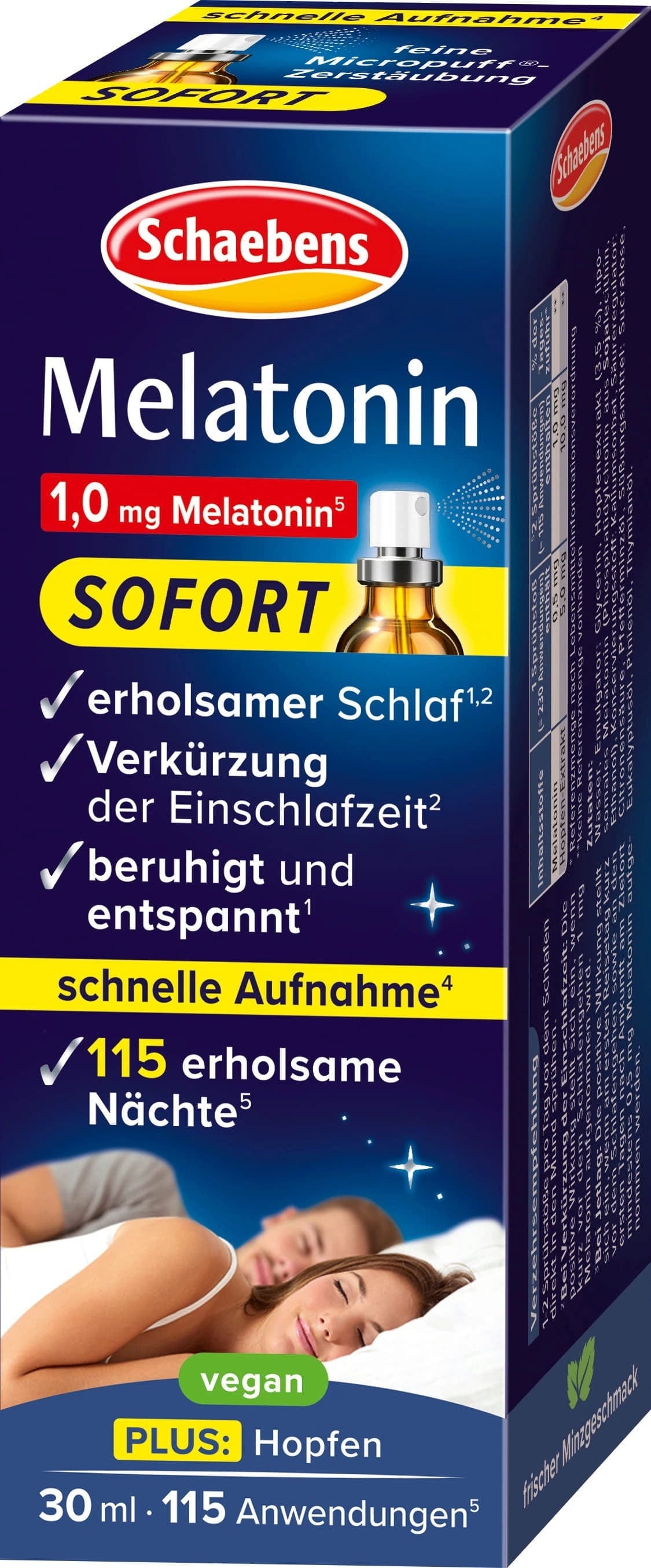 Dieses Sofort-Spray von Schaebens enthält Melatonin, Eukalyptusöl, Pinienöl, Thymianöl sowie hochwertigen Hopfenextrakt.
