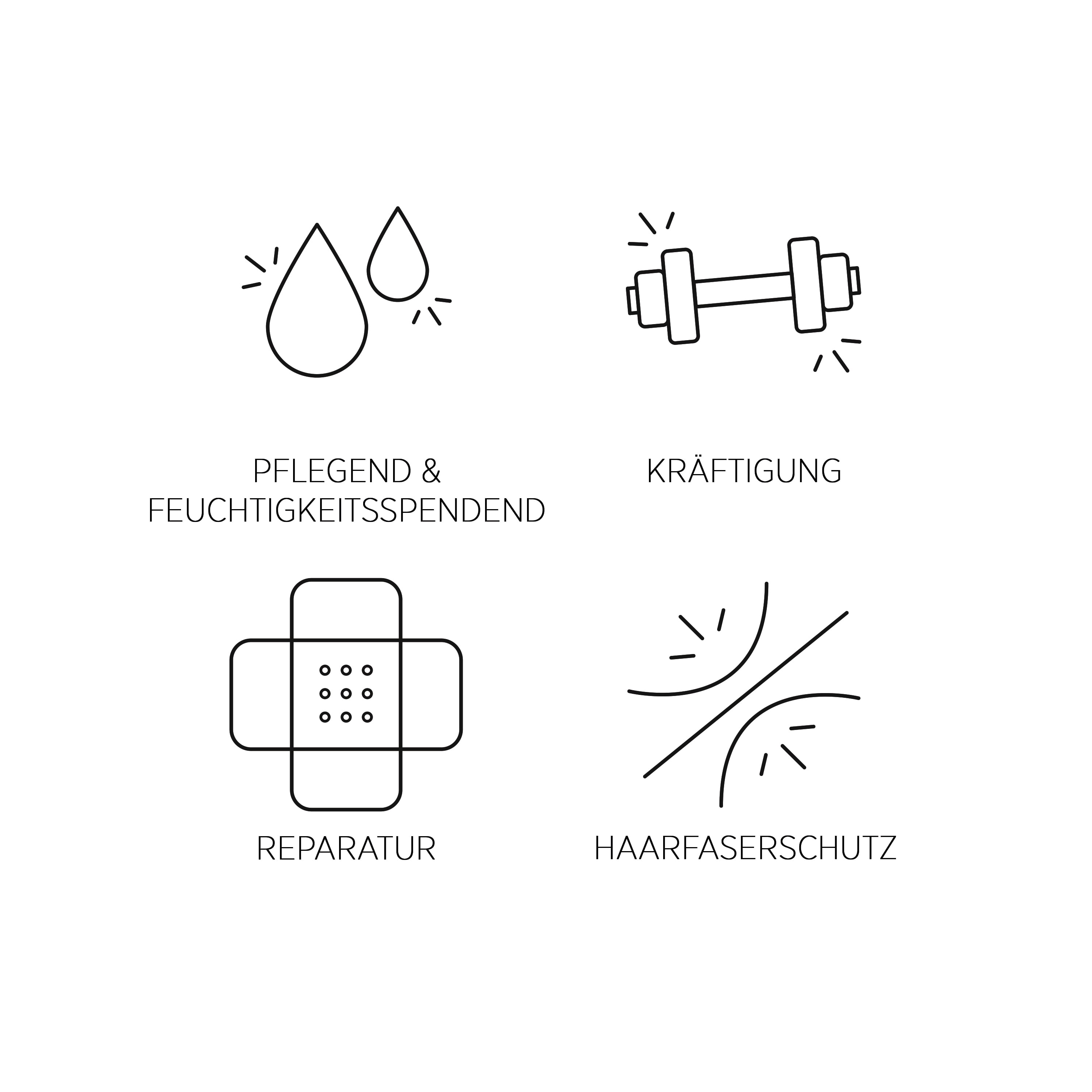 | Anwendung: | Arbeite die Maske sorgfältig ins feuchte Haar ein. Nach einigen Minuten Einwirkzeit kannst du die Maske wieder gründlich auswaschen. |