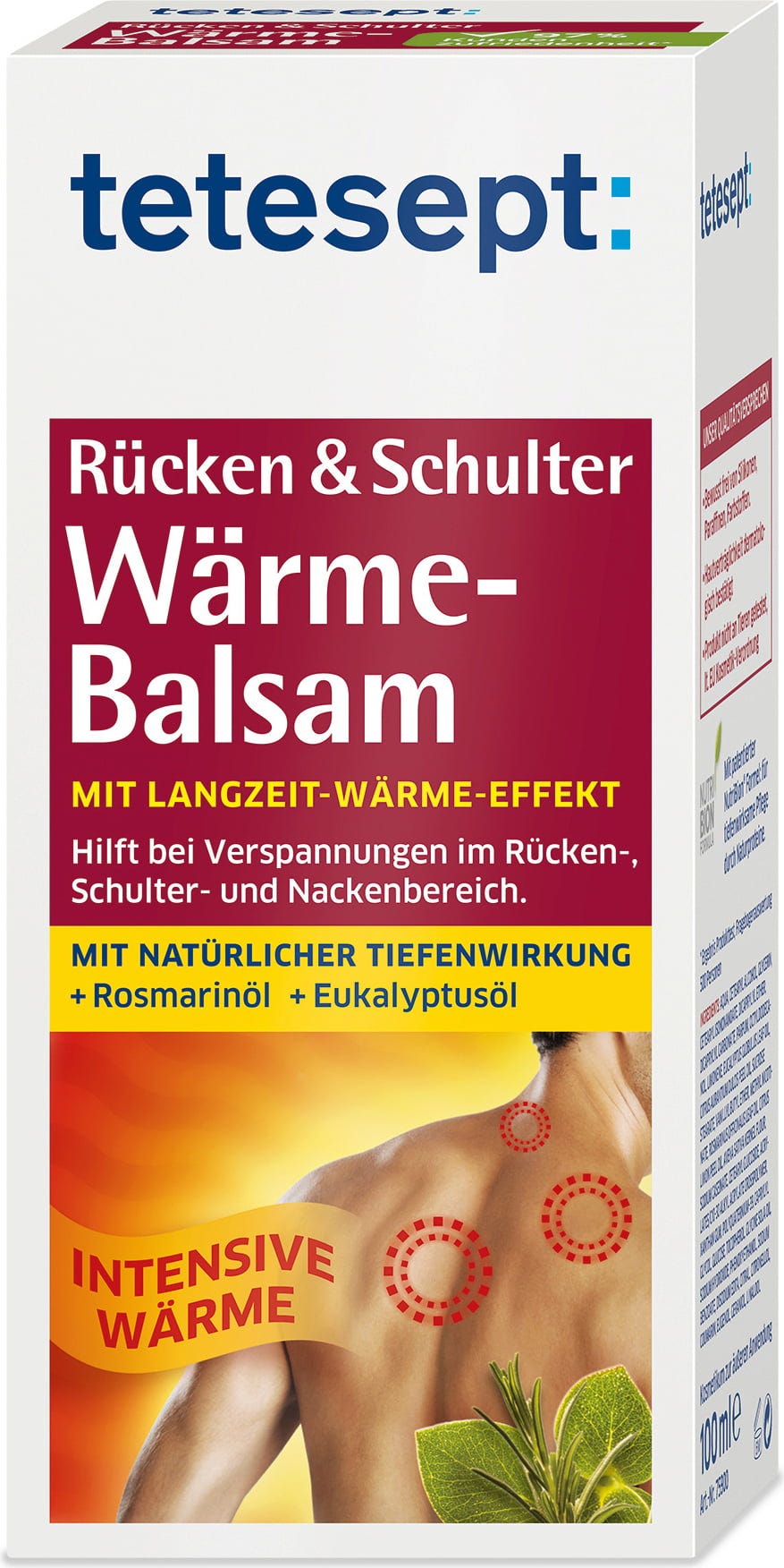 Mit dem Wärmebalsam von tetesept sorgst du im Rücken-, Schultern- und Nackenbereich für einen anhaltenden Wärmeeffekt! Der Balsam zieht schnell ein und fettet nicht und dank der Nutri-Bion®-Formel können die pflegenden Stoffe besonders gut in die Haut einziehen. Natürliche ätherische Öle aus Rosmarin, Eukalyptus und Zitrone runden das Produkt perfekt ab!