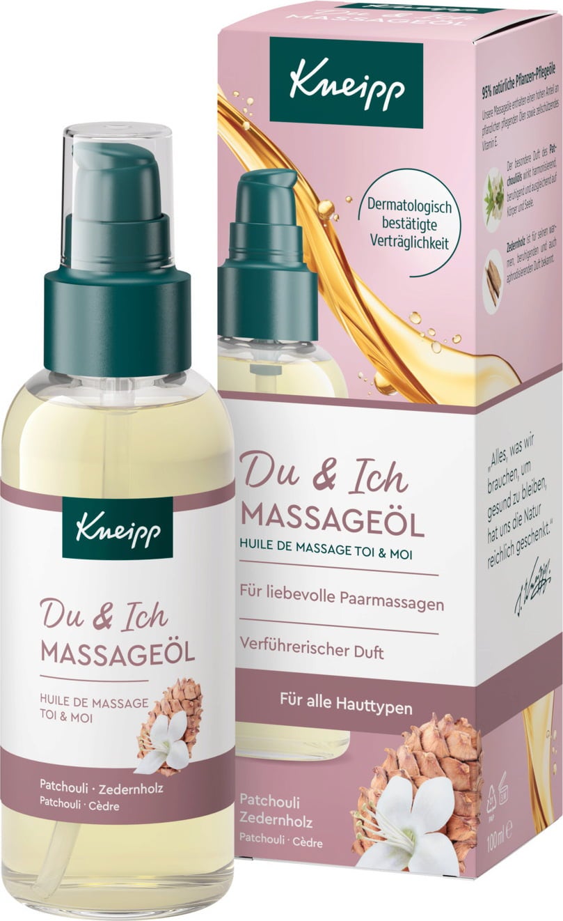 The You & Me massage oil by Kneipp contains nourishing plant oils, vitamin E and natural essential oils of cedarwood & patchouli. It gets slowly absorbed into the skin for a pleasant massage experience.