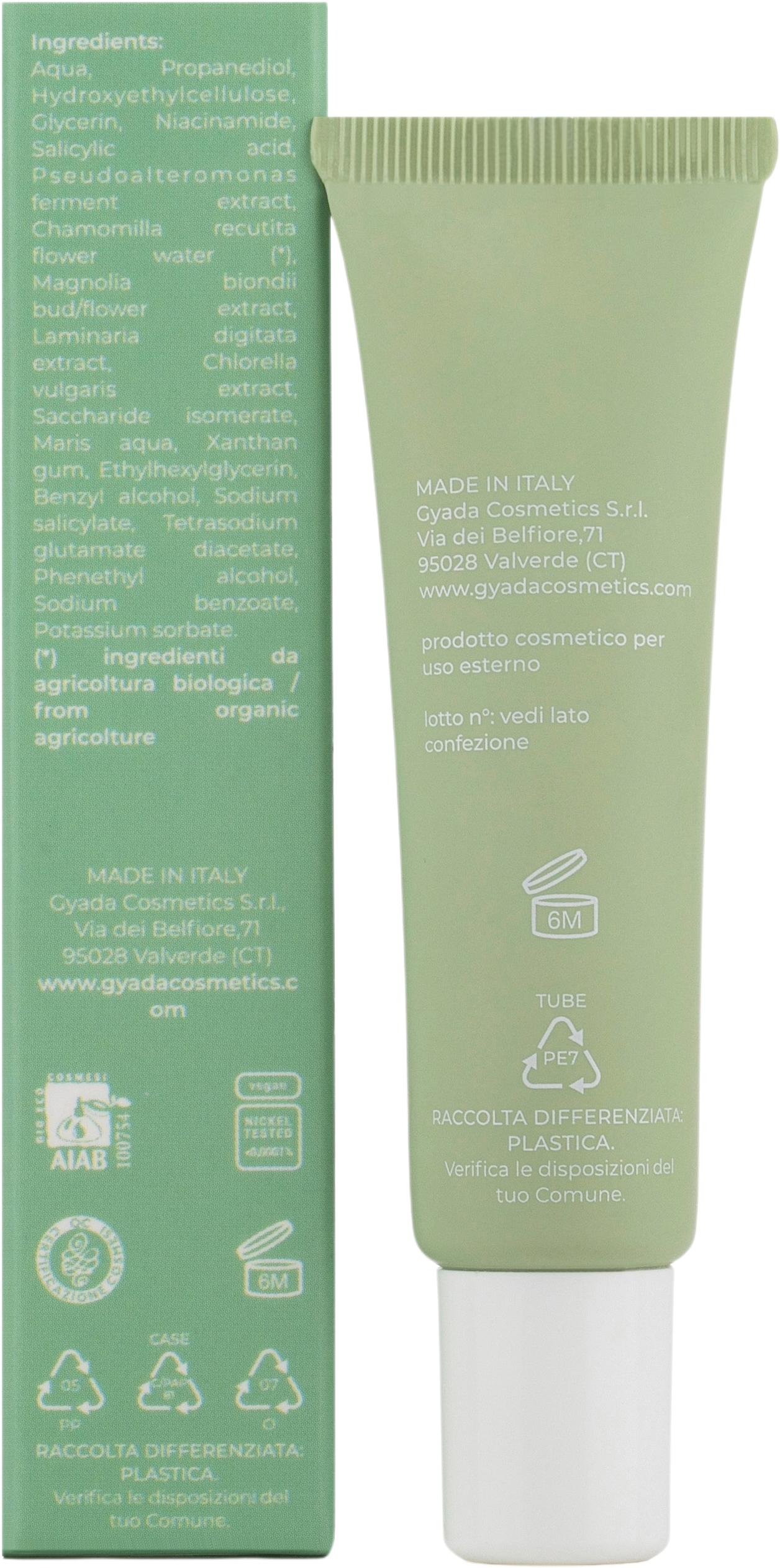Aqua, Propandiol, Hydroxyethyl Cellulose, Glycerin, Niacinamide, Salicylic Acid, Pseudoalteromonas Ferment Extract, Chamomilla Recutita Flower Water[1], Magnolia Biondii Bud/Flower Extract, Laminaria Digitata Extract, Chlorella Vulgaris Extract, Saccharide Isomerate, Maris Aqua (Sea Water), Xanthan Gum, Ethylhexylglycerin, Benzyl Alcohol, Sodium Salicylate, Tetrasodium Glutamate Diacetate, Phenylethanol, Sodium Benzoate, Potassium Sorbate