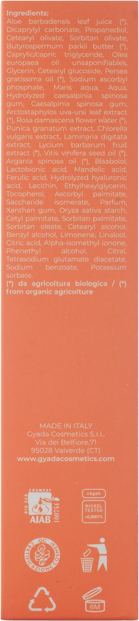 Aloe Barbadensis Leaf Juice[1], Dicaprylyl Carbonate, Propandiol, Cetearyl Olivate, Sorbitan Olivate, Butyrospermum Parkii (Shea) Butter[1], Caprylic/Capric Triglyceride, Olea Europaea (Olive) Oil, Glycerin, Persea Gratissima (Avocado) Oil[1], Rosa Damascena Flower Water[1], Argania Spinosa (Argan) Kernel Oil[1], Arctostaphylos Uva Ursi (Bearberry) Leaf Extract[1], Laminaria Digitata Extract, Lycium Barbarum (Goij) Fruit Extract[1], Punica Granatum (Pomegranate) Extract, Chlorella Vulgaris Extract, Vitis Vinifera Seed Oil[1], Caesalpinia Spinosa Gum, Hydrolyzed Caesalpinia Spinosa Gum, Mandelic Acid, Lactobionic Acid, Ferulic Acid, Hydrolyzed Hyaluronic Acid, Sodium Ascorbyl Phosphate (Vitamin C), Aqua, Aqua, Bisabolol, Tocopherol (Vitamin E), Ascorbyl Palmitate (Vitamin C), Lecithin, Benzyl Alcohol, Cetearylalcohol, Cetyl Palmitate, Sorbitan Palmitate, Parfum, Sorbitan Oleate, Oryza Sativa (Rice) Starch, Xanthan Gum, Ethylhexylglycerin, Tetrasodium Glutamate Diacetate, Limonene, Linalool, Citricacid, Alpha-Isomethyl Ionone, Phenylethanol, Saccharide Isomerate, Citral, Sodium Benzoate, Potassium Sorbate