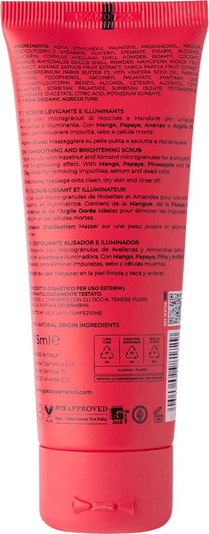 Ce gommage doux et fruité contient des particules exfoliantes exclusivement végétales de noisettes et d'amandes, qui éliminent les cellules mortes de la peau tout en douceur. La mangue, la papaye et l'ananas contiennent de la précieuse vitamine C à effet anti-âge naturel, des bêta-carotènes et des flavonoïdes qui renforcent la peau. L'argile blanche est idéale pour éliminer les impuretés et le sébum, et le beurre de karité laisse la peau douce et souple.