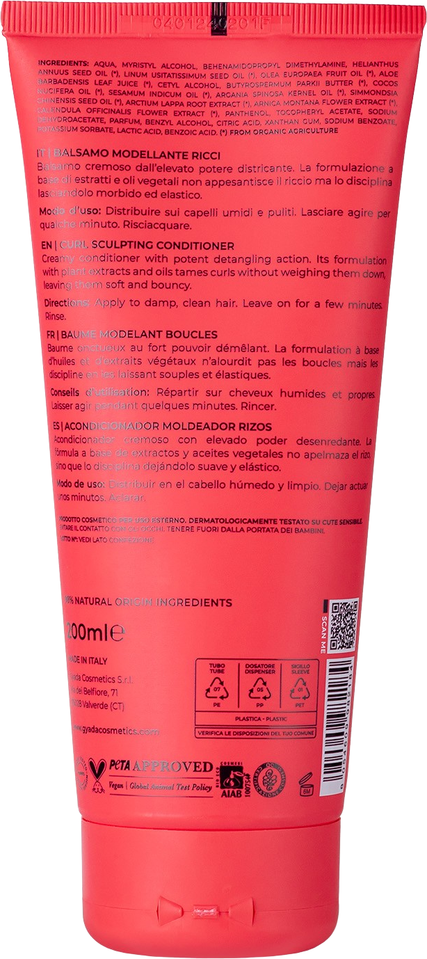 Modo d'uso: usare dopo lo shampoo su capelli bagnati, applicando la giusta quantità di prodotto e distribuirla sulle lunghezze. Lasciare agire qualche minuto e risciacquare. Si consiglia l’uso in associazione allo shampoo modellante ricci Gyada Cosmetics.
