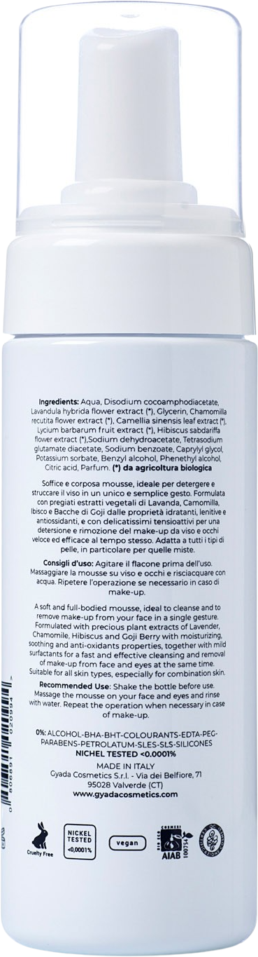 Questa mousse detergente e struccante è soffice come una nuvola sulla pelle! Ideale per detergere e struccare il viso in un unico e semplice gesto, contiene pregiati estratti vegetali di camomilla, lavanda, ibisco e bacche di goji dalle proprietà idratanti, lenitive e antiossidanti. I delicatissimi tensioattivi vegetali permettono una detersione efficace e una rimozione del make- up da viso e occhi veloce e delicata al tempo stesso. Adatta a tutti i tipi di pelle, in particolare per quelle miste.