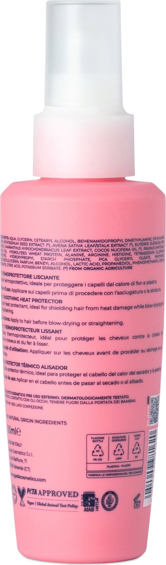 Modo d'uso: spruzzare sui capelli prima di asciugarli o lisciarli.