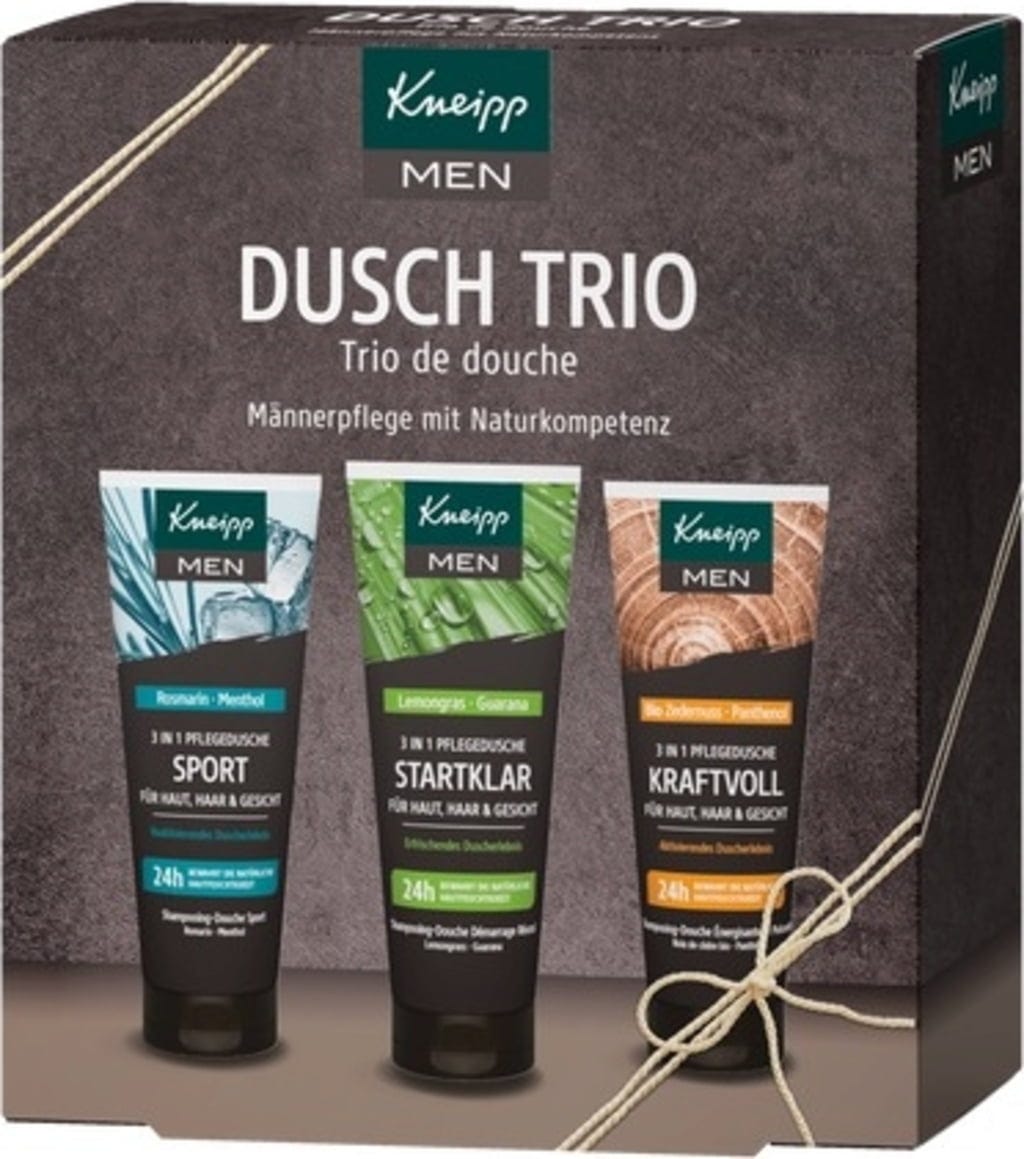Il trio doccia Kneipp MEN include tre diversi gel doccia 3 in 1 per corpo, capelli e viso in pratici formati prova. Le formule detergono delicatamente e offrono una piacevole esperienza di doccia, ideale per iniziare la giornata o dopo l'attività sportiva.