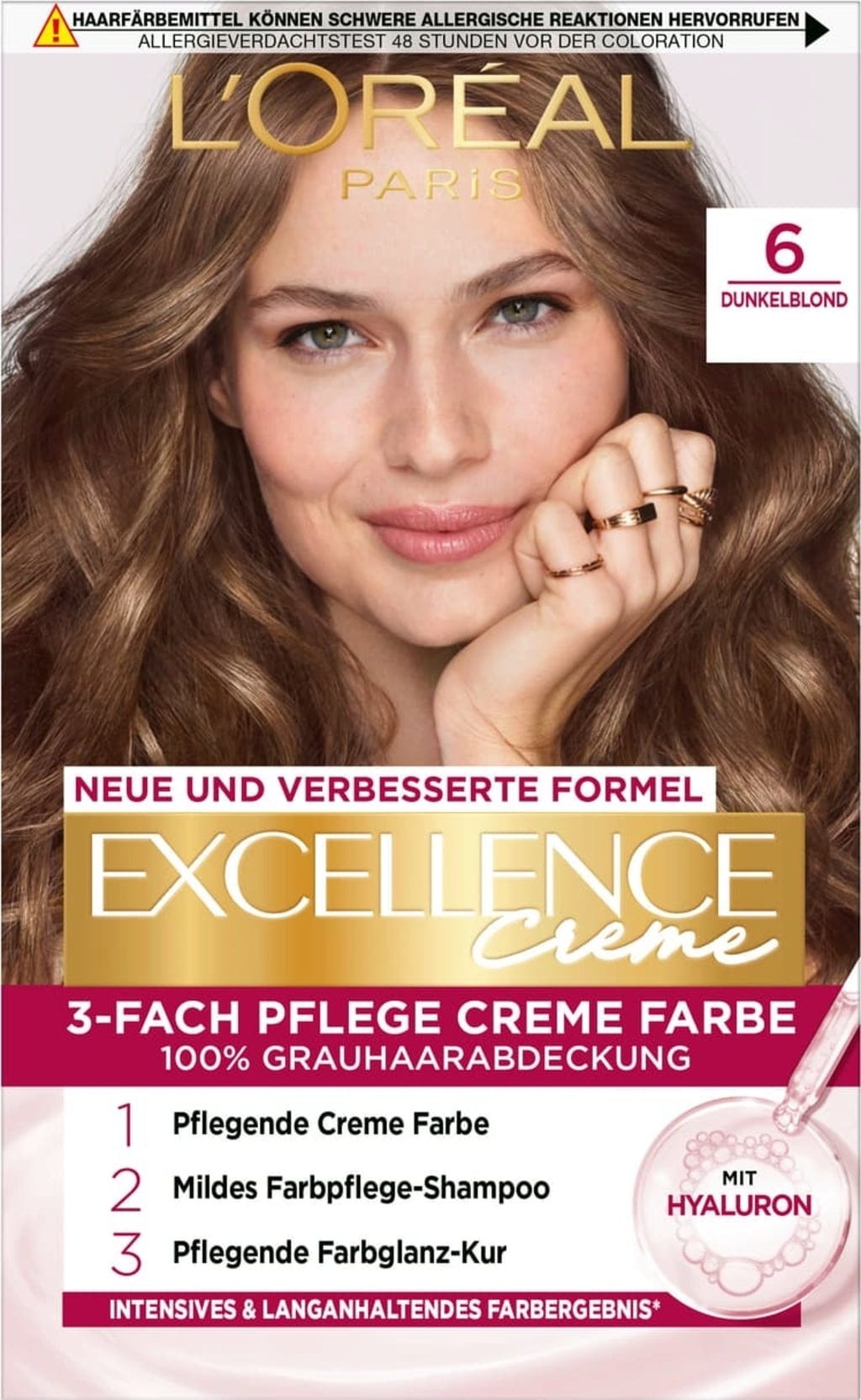 La colorazione permanente EXCELLENCE Crème non solo dona un colore favoloso alla tua chioma, ma se ne prende anche cura. Infatti, nella confezione troverai una crema colorante protettiva, un rivelatore, uno shampoo a pH dolce post colorazione e una maschera nutriente leggera. In questo modo, potrai prenderti cura dei capelli e del cuoio capelluto subito dopo la colorazione.