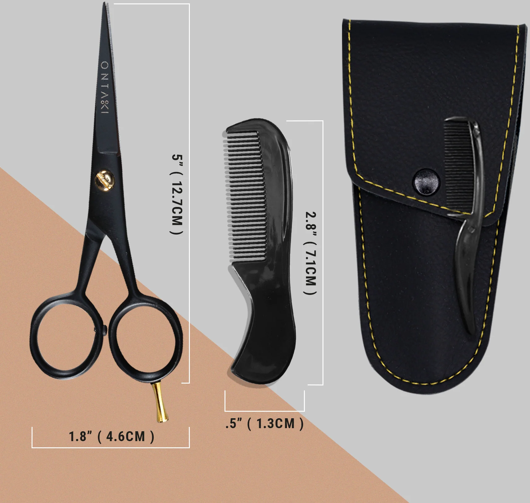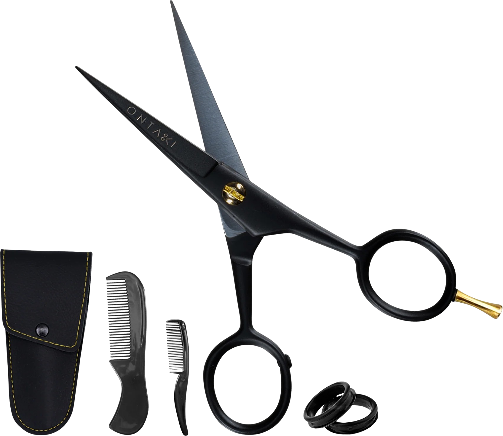 ONTAKI German Steel Beard & Mustache Scissors with Finger Rest - Black -5" + 2 Combs & Carrying Pouch