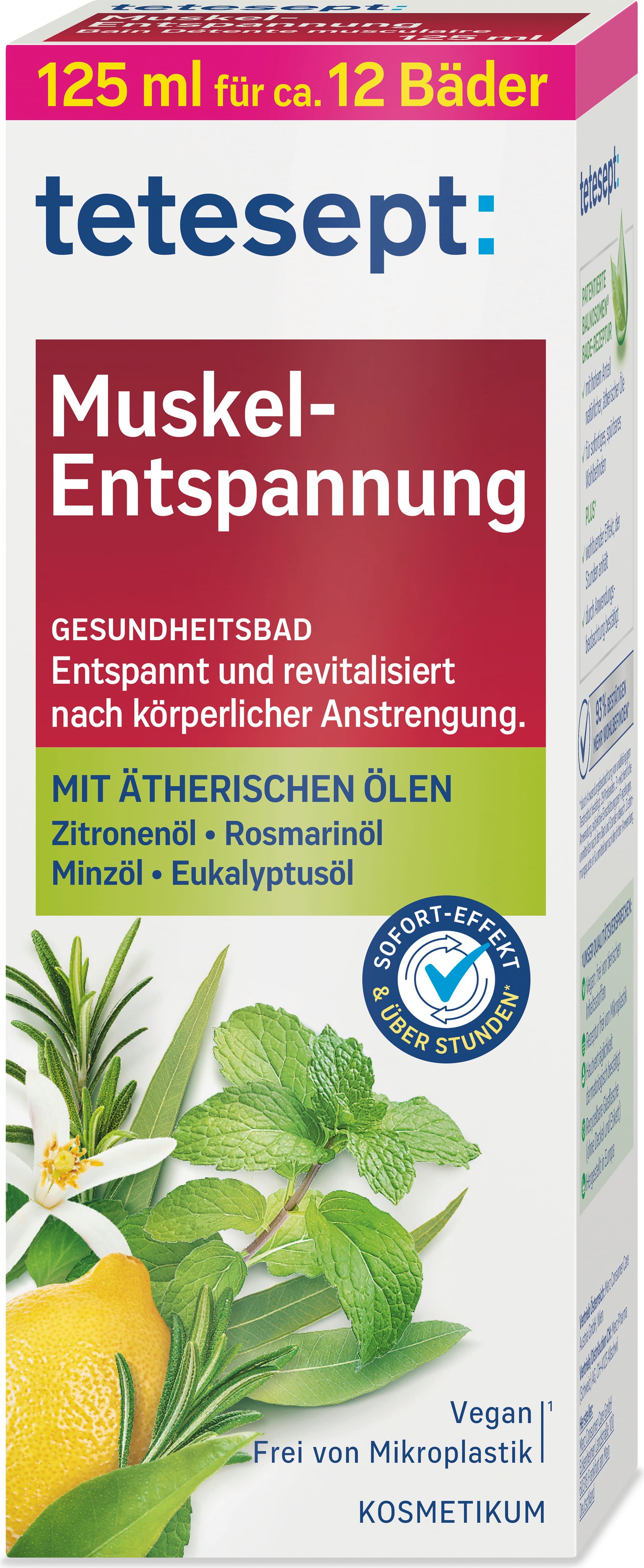 Ti sei stancato dopo un allenamento o un'escursione? Allora concediti una pausa e goditi il Bagno - Rilassamento Muscolare di tetesept! Questo concentrato da bagno ha una formula delicatamente schiumogena che nutre la pelle. Gli oli essenziali naturali di limone, rosmarino, menta, eucalipto e canfora emanano una fragranza meravigliosa e sprigionano le loro proprietà benefiche.