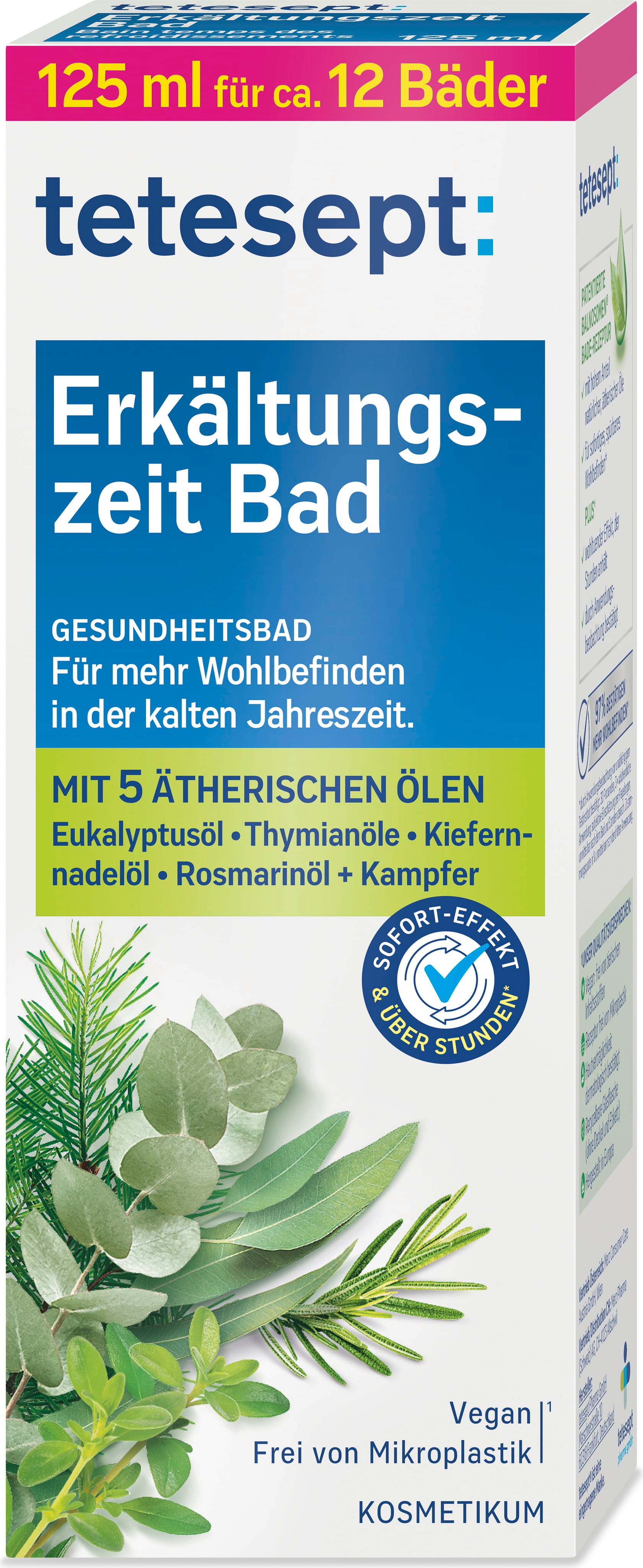 Soprattutto nella stagione fredda e umida, è meraviglioso premiarsi con un bel bagno caldo dopo una lunga giornata! Il Bagno - Tempo di Raffreddore di tetesept è la scelta perfetta. La sua formula vegana e senza PEG ha proprietà nutrienti per la pelle e contiene solo oli essenziali naturali di eucalipto, aghi di pino, timo e rosmarino.