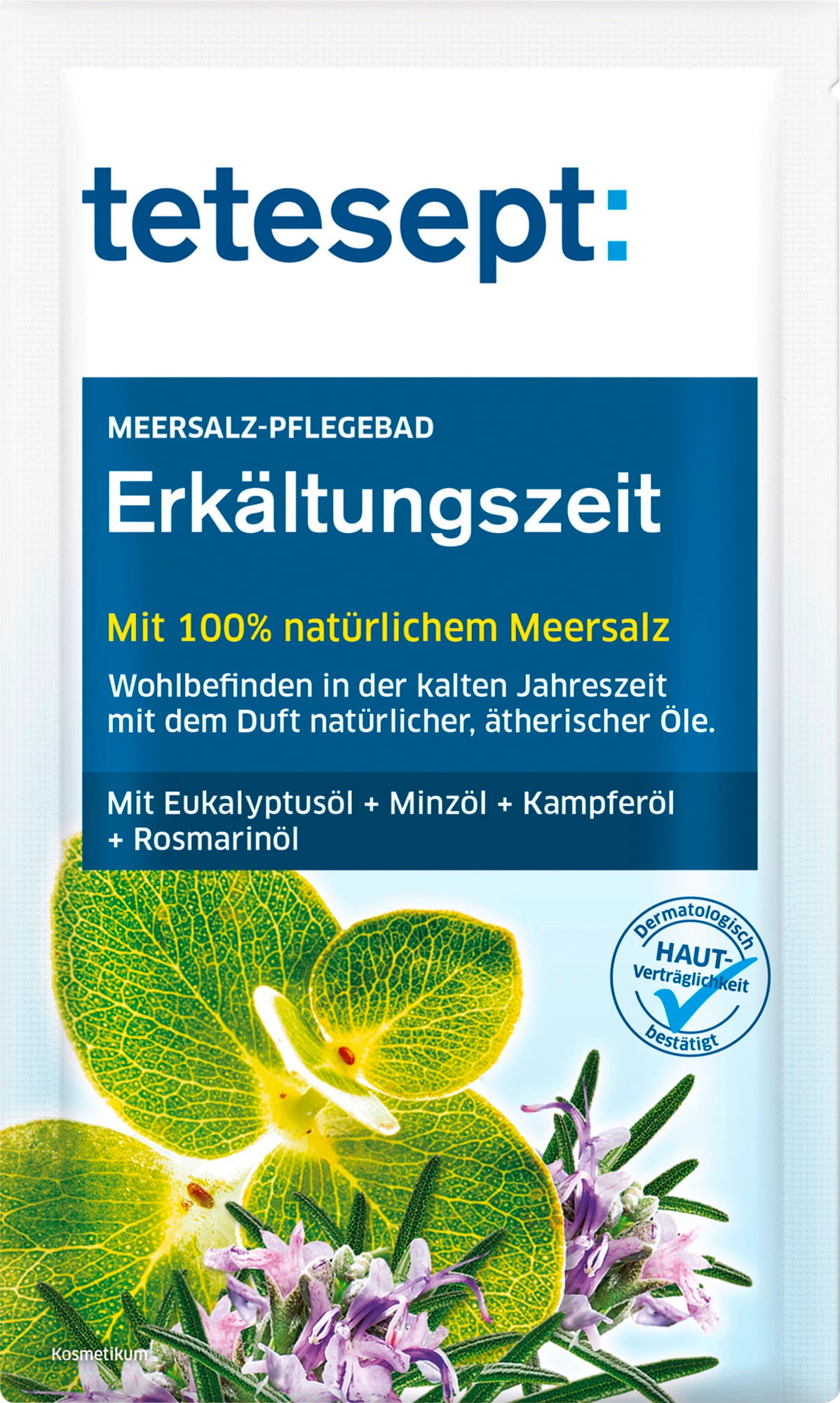 Soprattutto nella stagione fredda e umida, è meraviglioso premiarsi con un bagno caldo e rinfrescante dopo una lunga giornata! Il Sale Marino - Tempo di Raffreddore di tetesept è la scelta perfetta. La sua formula vegana ha proprietà curative per la pelle e contiene solo oli essenziali naturali di eucalipto, menta, rosmarino e canfora.