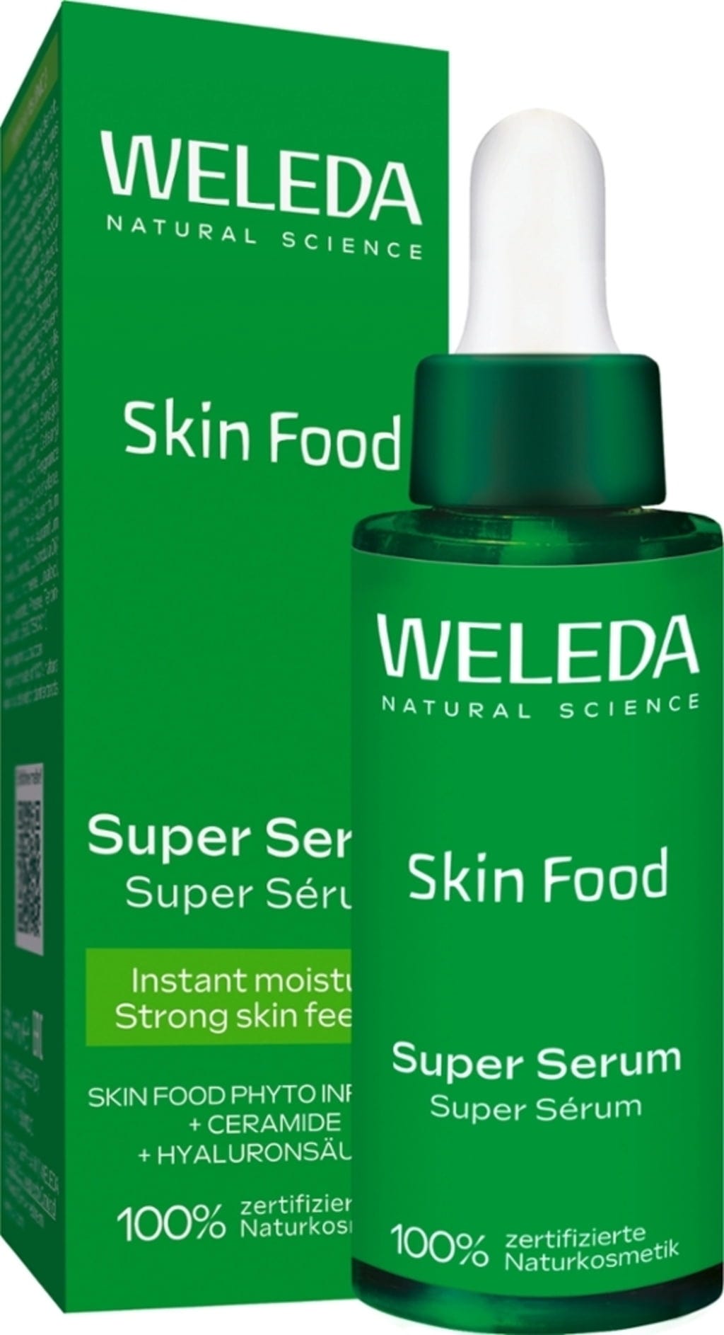 Il Super Siero nutre la pelle con una miscela di acido ialuronico e Skin Food Phyto-Infusion di Weleda, a base di estratti di alta qualità di camomilla, calendula, rosmarino e viola. Idrata istantaneamente la pelle e le dona una luminosità unica.